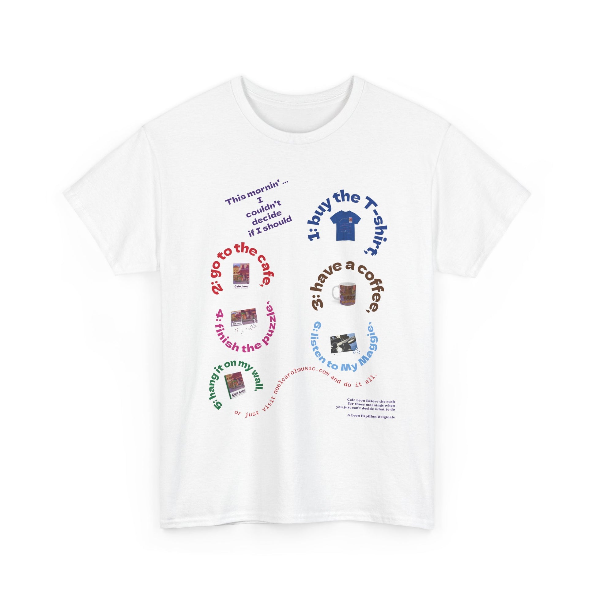 As usual, Noel and his team are bringing you an absolute one-of-a-kind product. This T-shirt displays examples of the current variety of product we offer, which is tailored around our Cafe Leon model. Yeah, on this T-shirt, we're exhibiting a Cafe Leon T-shirt, several Cafe Leon canvas wall prints, one of our Cafe Leon mugs, and a Cafe Leon puzzle. As a bonus, we've included a puzzle of Noel Carol playing My Maggie.